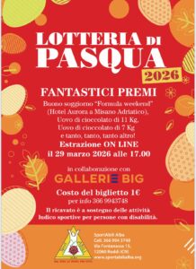 L’Estrazione dei biglietti vincenti potrà essere seguita online, sulla pagina Facebook Sportabili Alba, domenica 29 marzo 2026 dalle ore 17.