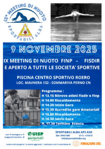Domenica 9 novembre si è tenuto il IX Meeting di Nuoto  organizzato da SportABILI ALBA APS ASD. Nell’impianto natatorio messo a disposizione da CSR di Sommarica Perno si sono ritrovati ben 120 atleti, iscritti alle federazioni FINP e  FISDIR, e alcuni atleti della categoria “amatoriali”, tutti a rappresentare le 10 società sportive che hanno aderito alla nostra proposta: Pegaso Asti, Senza Limiti Torino, Specialmente Torino, Fuori Onda Torino,  ASD Pandha Torino, Paideia Torino, Ecole Du Sport Val d’Aosta, ASCD Silvana Baj’ Alessndria, Centro Sportivo Roero e ovviamente gli atleti di SportABILI ALBA.